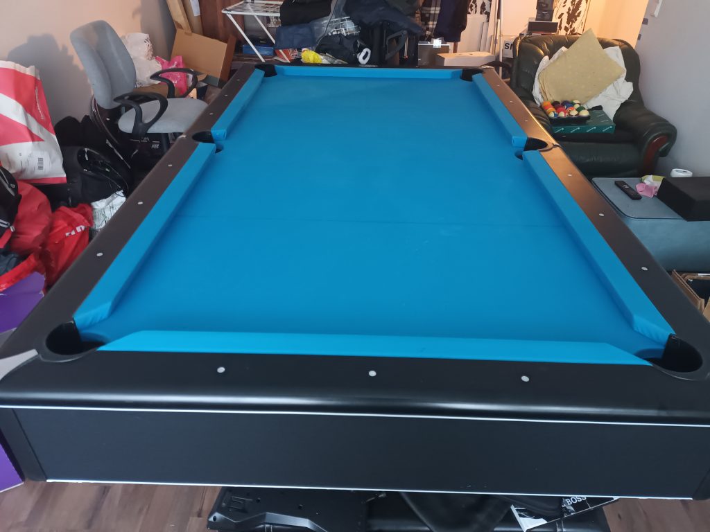 Hienokuntoinen musta Imperial Eliminator 7′ biljardipöytä. Kolmeosainen kivilevy. Säätöjalat.