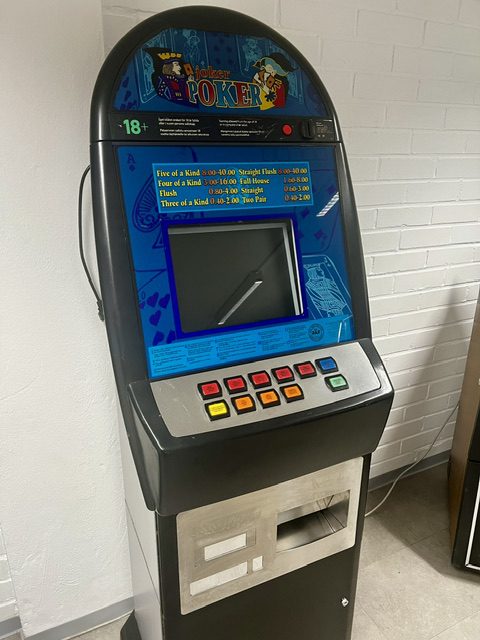 Pokeriautomaatti legendaarisilla tuplausäänillä. Toimii 2 €, 1 €, 50 c ja 20 c kolikoilla. Maksaa voitot