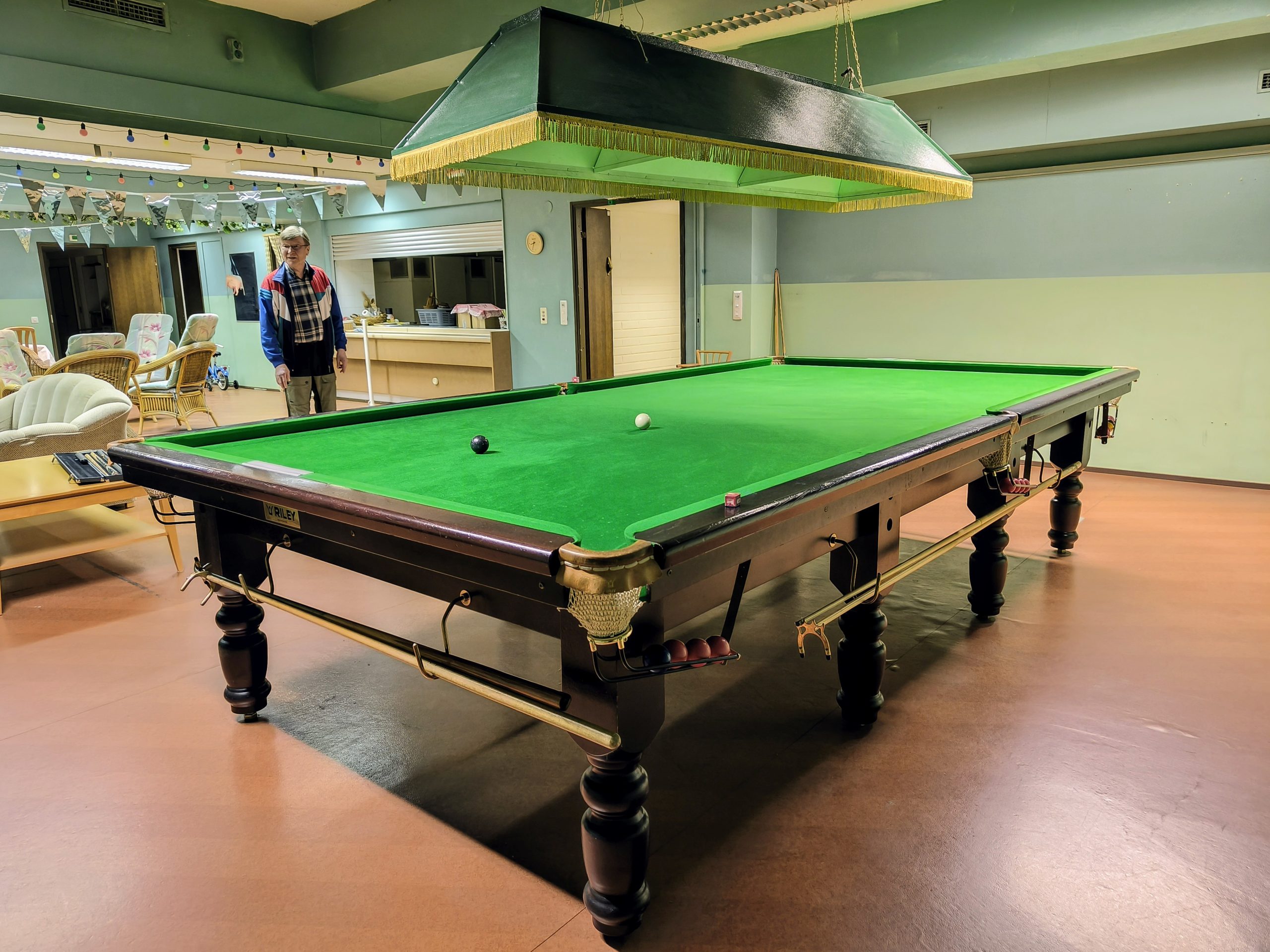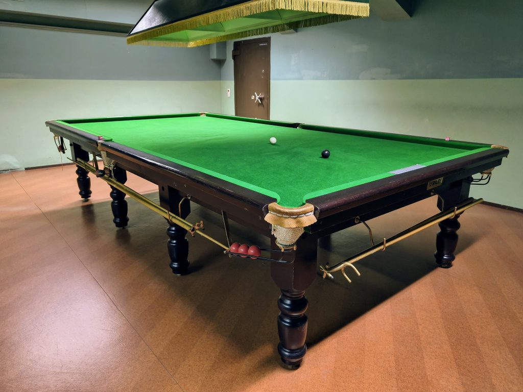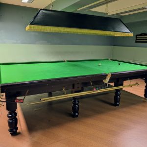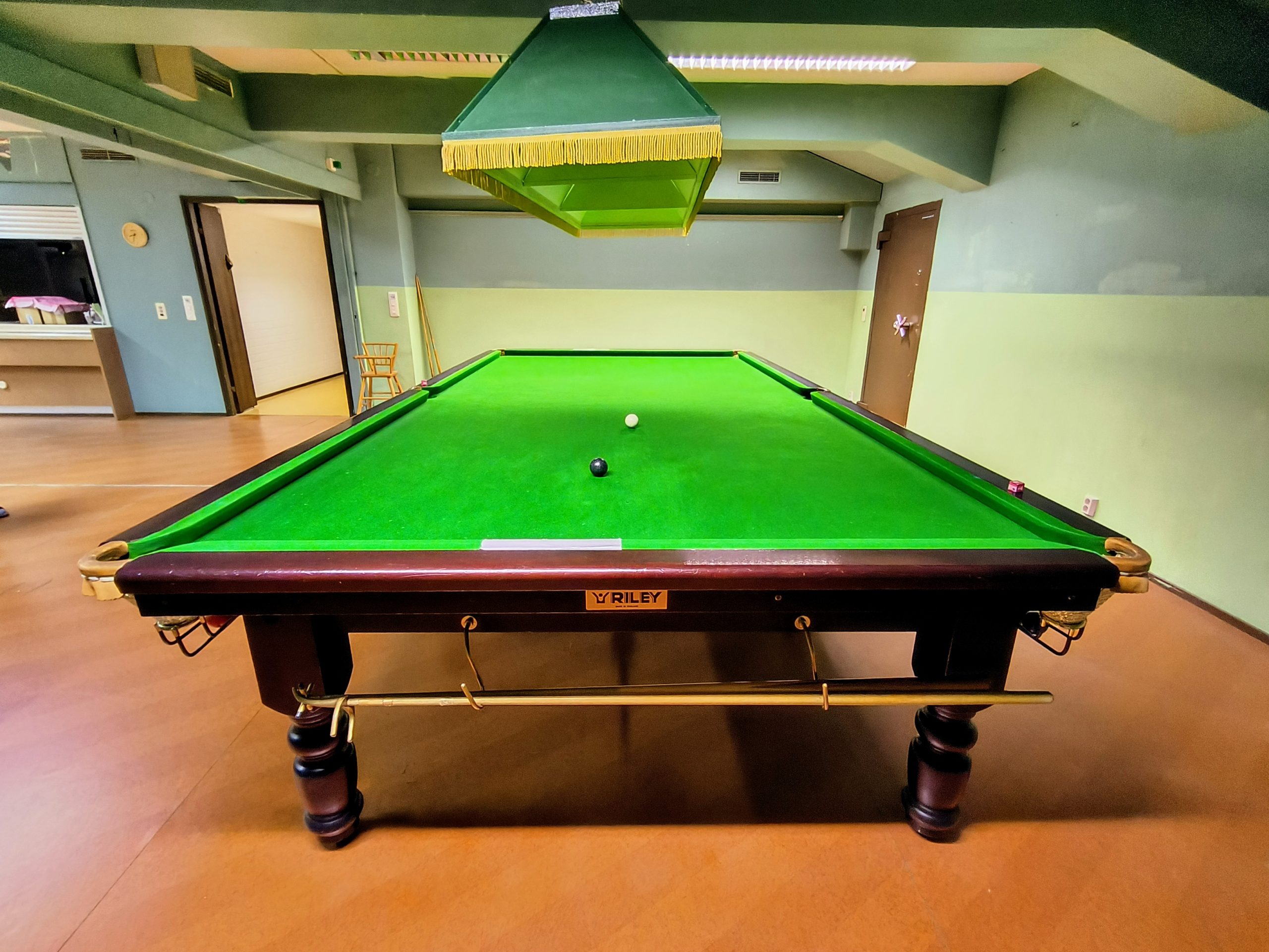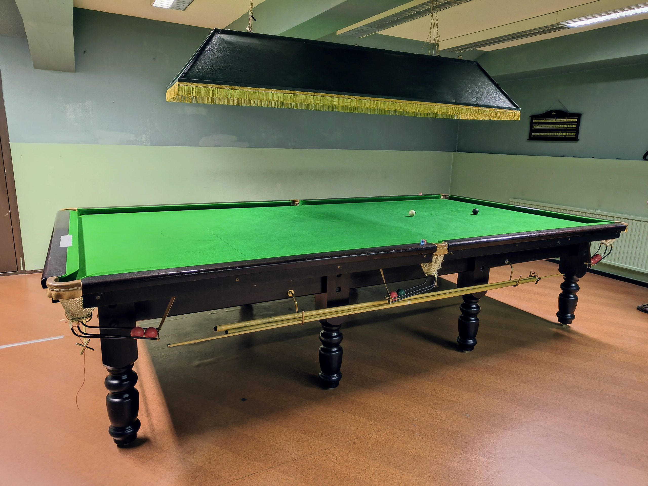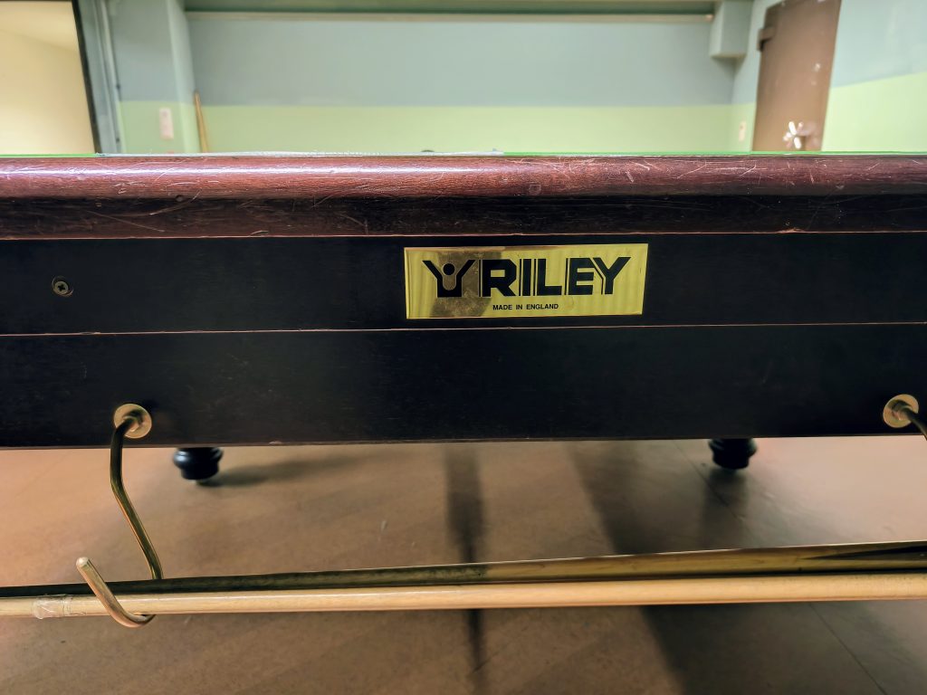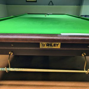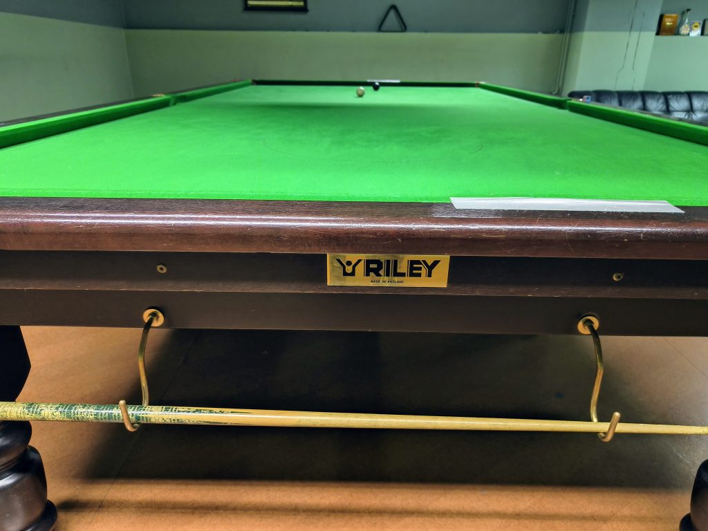 Hyväkuntoinen käytetty Riley 12′ snookerpöytä. Mukaan kuvissa näkyvä valaisin ja käytetyt pelivälineet.