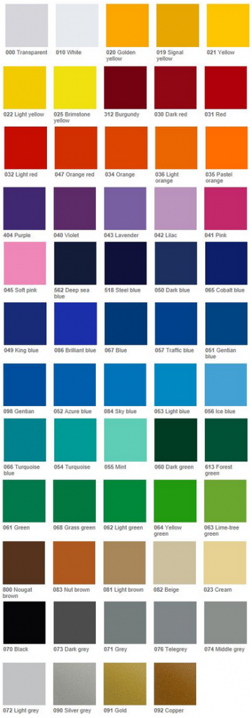 Kirkas lasikansi, jonka alapintaan on pysyvästi painettu värikalvo. Voit valita värin oheisesta värikartasta.