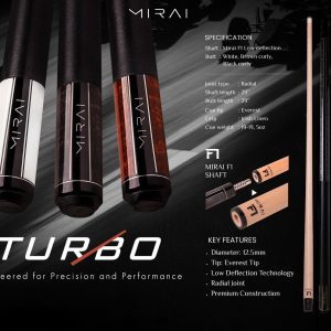 Mirai Turbo -uutuusbiljardikeppi on suunniteltu pelaajille, jotka vaativat huippusuoritusta tarkkuuden, hallinnan ja voiman suhteen. Huippuluokan Mirai F1 -saftin ansiosta biljardikeppi minimoi taipumisen ja mahdollistaa vertaansa vailla olevan tarkkuuden jokaisella lyönnillä.
