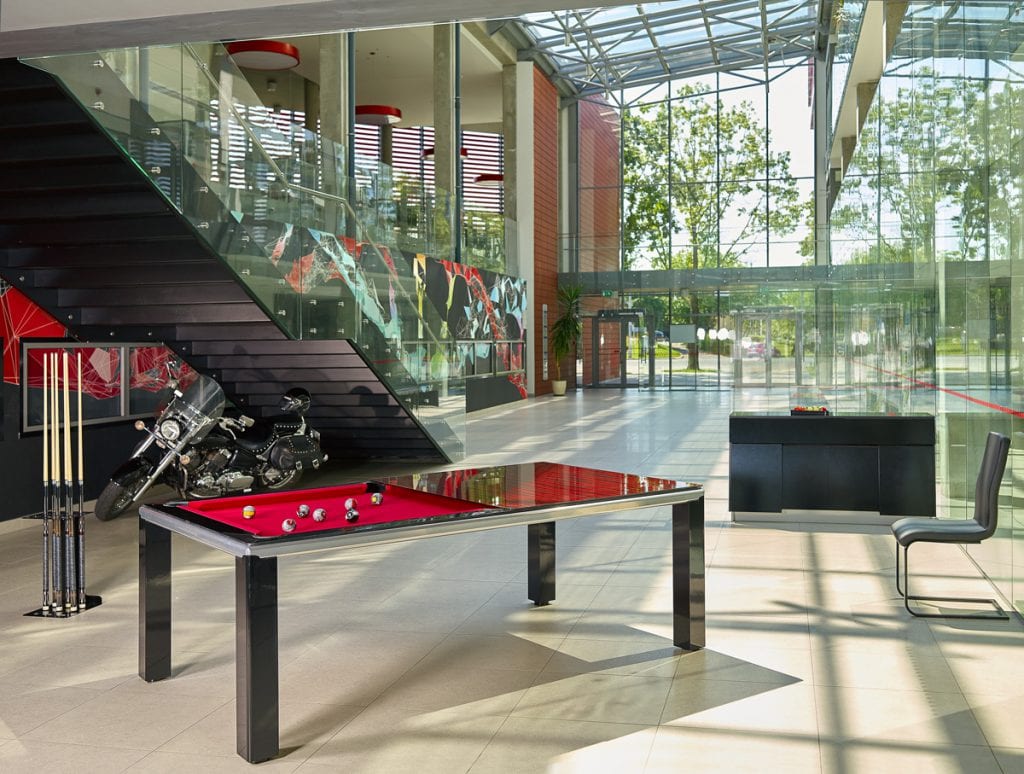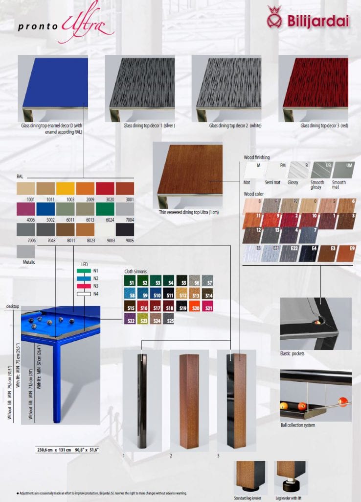Ultra Diner biljardipöytä on uutuus, jollaista biljardimaailmassa ei ennen ole nähty. Ultra on valmistettu teräksestä, jolloin sen runko on saatu hämmästyttävän ohueksi mutta silti tukevaksi. Ulkonäkö on linjakkuudessaan häkellyttävä. Rungon paksuus ilman kantta on vain 7 cm! Lisäksi erittäin ohut ruokapöytäkansi vain lisää pöydän eleganssia. Kannenkin kanssa pöydän paksuus on vain 8 cm! Pronto Ultra on maailman ohuin biljardipöytä.